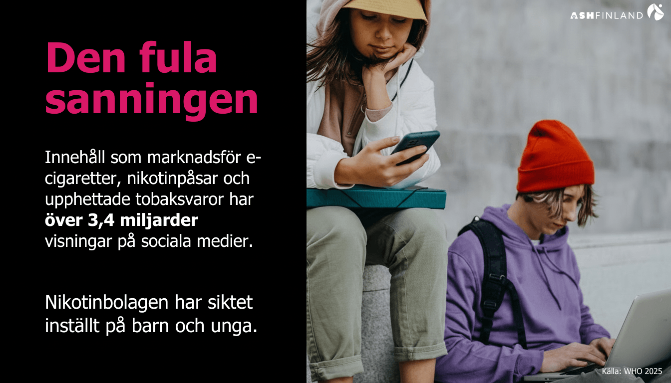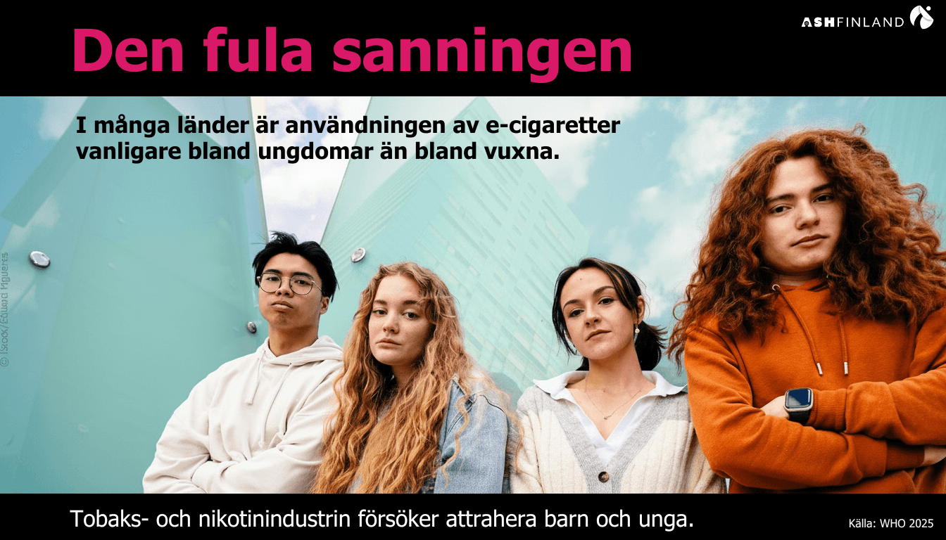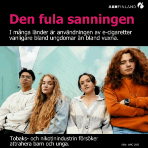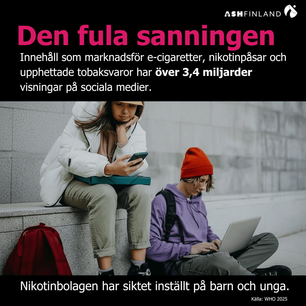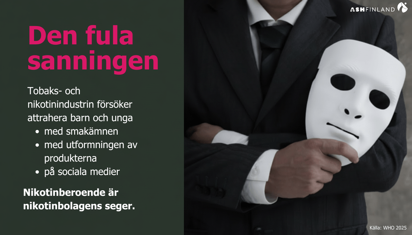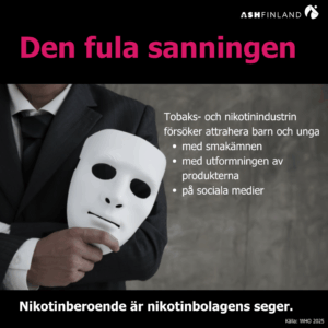 WHO:n Maailman tupakattoman päivän 31.5.2026 teemana on tupakkateollisuuden toimintatapojen paljastaminen, ”Unmasking the appeal”. Suomen ASH tarjoaa käyttöösi suomen- ja ruotsinkielistä aineistoa, jolla päivän tärkeää sanomaa voi tuoda esille esimerkiksi sosiaalisessa mediassa.