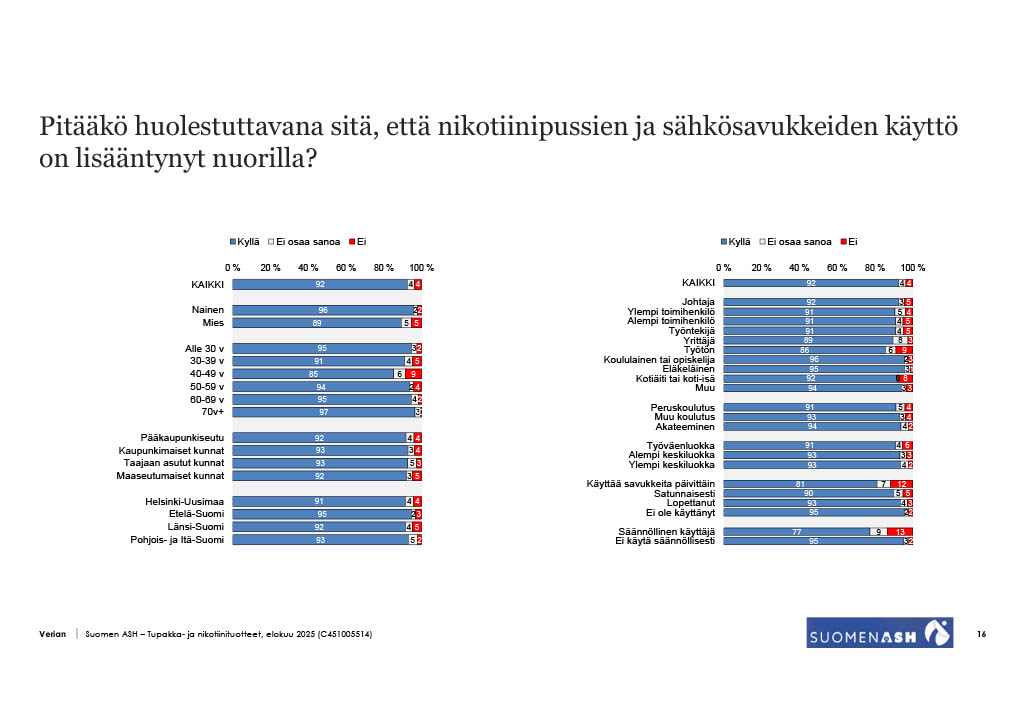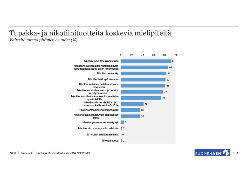 Suomen ASH selvitti mielipidekyselyllä suomalaisten käsityksiä tupakka- ja nikotiinituotteista sekä nikotiinin haitoista. Kysely paljasti, että suurin osa nikotiinin haitoista tunnetaan hyvin. Väestö on huolissaan nikotiinipussien ja sähkösavukkeiden lisääntyneestä käytöstä nuorten keskuudessa. Tupakka- ja nikotiinituotteiden ikärajan nostamista 20 vuoteen kannatetaan laajasti.