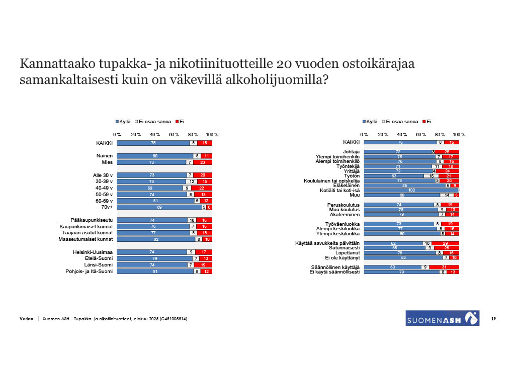 Kyselyssä selvitettiin myös, kannattavatko suomalaiset tupakka- ja nikotiinituotteille 20 vuoden ostoikärajaa samankaltaisesti kuin on väkevillä alkoholijuomilla. Peräti kolme neljästä suomalaisesta (76 %) on tätä mieltä.