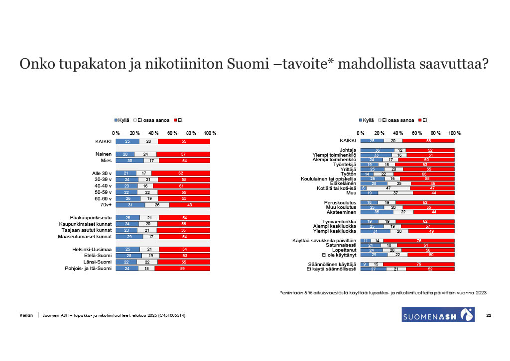 Suomen tupakkalakiin on kirjattu tavoite, että Suomi on tupakaton ja nikotiiniton vuoteen 2030 mennessä. Tavoite merkitsee, että alle 5 % aikuisväestöstä käyttäisi tupakka- tai nikotiinituotteita päivittäin. Vastaajilta kysyttiin, onko tavoite heidän mielestään mahdollista saavuttaa.
