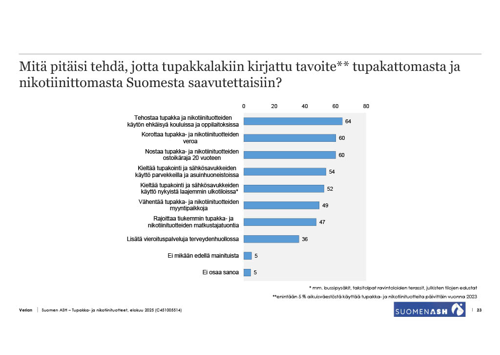 Eniten kannatusta saivat tupakka- ja nikotiinituotteiden käytön ehkäisyn tehostaminen kouluissa ja oppilaitoksissa (64 %) sekä tupakka- ja nikotiinituotteiden veron korottaminen (60 %). Tämän kysymyksen kohdalla – vaikka vaihtoehtoja olikin paljon – ikärajan nostaminen sai kannatusta 60 %.