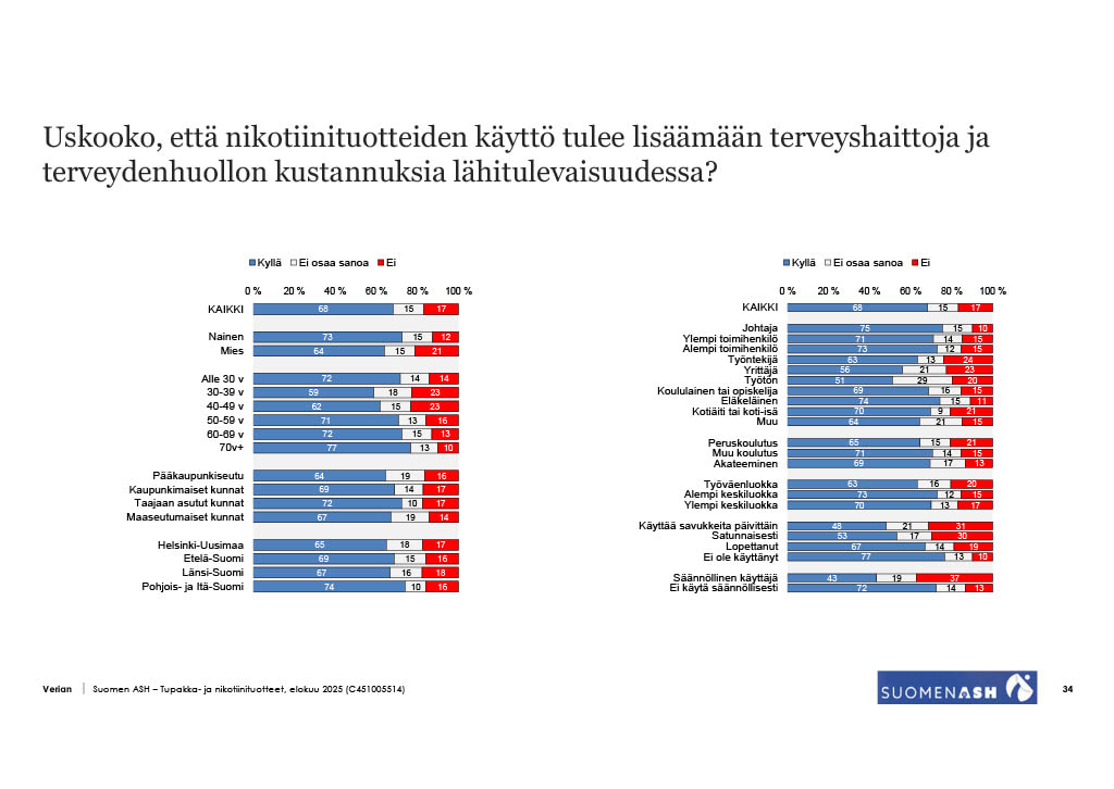 Suurin osa suomalaisista (68 %) uskoo, että nikotiinituotteiden käyttö tulee lisäämään terveyshaittoja ja terveydenhuollon kustannuksia lähitulevaisuudessa.
