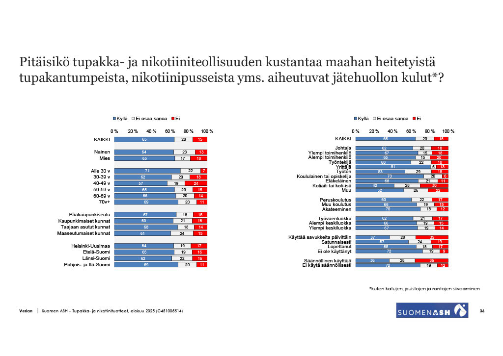 Vastaajille esitettiin kysymys: Pitäisikö mielestäsi tupakka- ja nikotiiniteollisuuden kustantaa maahan heitetyistä tupakantumpeista ja nikotiinipusseista yms. aiheutuvat jätehuollon kulut kuten katujen, puistojen ja rantojen siivoaminen?