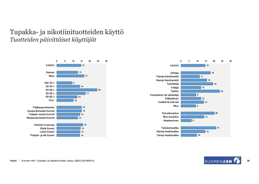Savukkeita käytti päivittäin 11 %, nikotiinipusseja 3 %, nuuskaa 1 % ja sähkösavuketta 1 %.